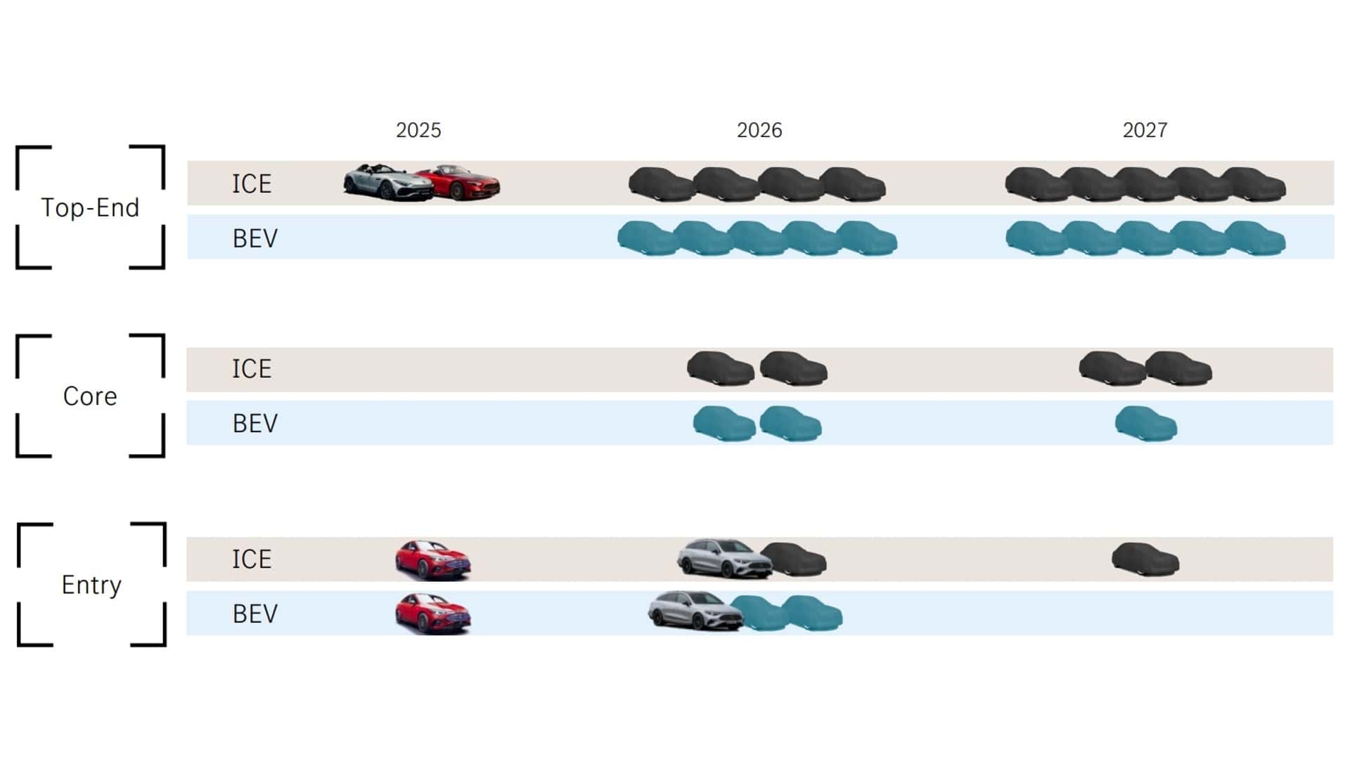 2027 will be nearly as busy, with one gas car in the Entry class, two more in the Core segment, and another five at the upper end of the lineup. On the EV side, there will be a Core model without a combustion engine, along with five zero-emission vehicles in the Top End.
