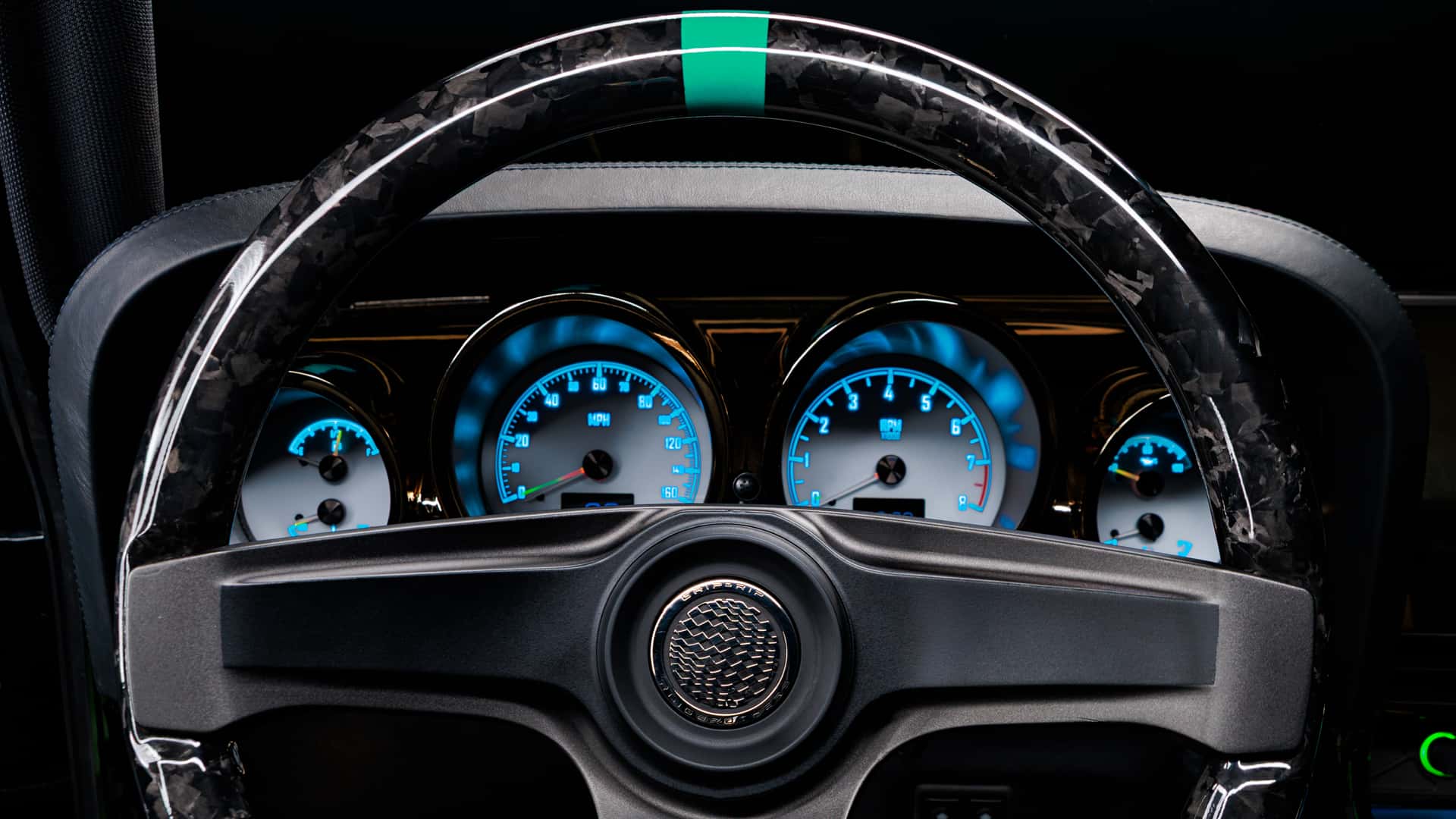Other fantastic details include a carbon taillight panel, which sits between six individual lighting elements that borrow the Mustang's tri-bar style. Bright, LED headlights and fog lights with yellow bulbs give a comic-book villain vibe to the front end when illuminated, and predictably, there isn't a lick of brightwork to be found save on the polished barrels of the staggered HRE wheels. The primary paint is called Bootleg Black, with an unfortunately named "Grab-Her Green" appearing on the Ringbrothers grille badge and brake calipers. Whatever you call it, the color scheme does look decidedly wicked – Cynthia Erivo's warming up her voice as we speak.