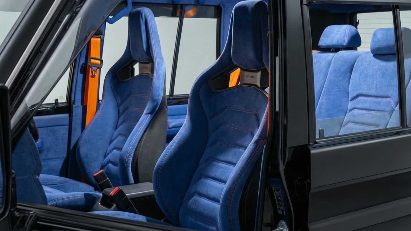 Though the outside is all dark and subtle, the interior is anything but. PVS fitted a pair of Recaro sports bucket seats, and virtually every surface has been covered in matching indigo-colored Alcantara. That includes the dash and door panels, the ceiling, and, of course, all of the seats. Even the custom rear drawer storage system is covered in the stuff. The upholstery also features orange contrast stitching, and the seatbelts were changed to a matching orange. Naturally, a couple of PVS's own products show up including the aforementioned infotainment screen and a custom steering wheel.