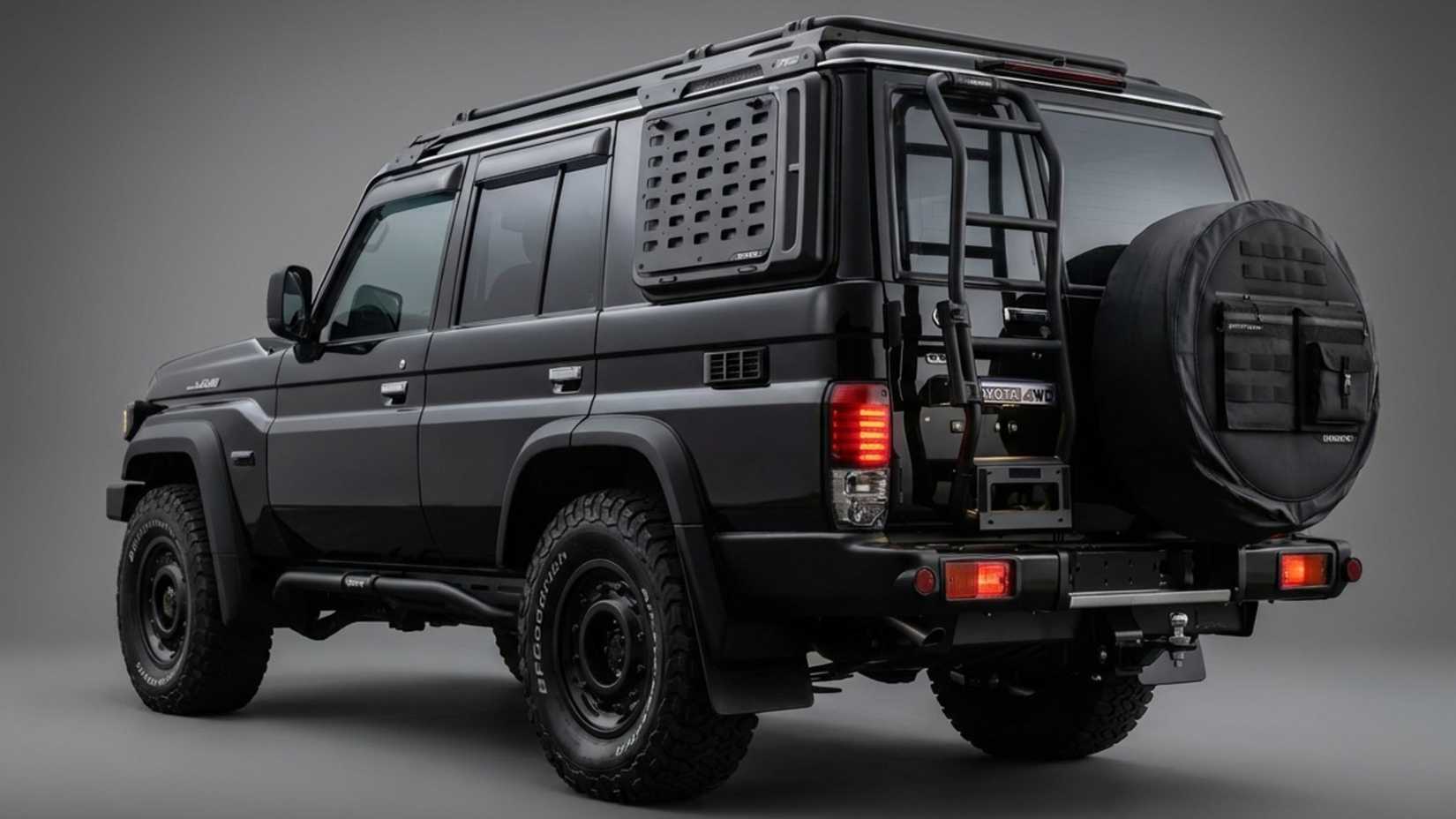 The starting point was a black 2025 Land Cruiser SUV with a turbocharged 2.8-liter four-cylinder diesel and a six-speed automatic. It also makes the stock amount of power and torque at 201 horses and 369 pound-feet. The outside is covered with Urnieta parts, including the front bumper, side steps, wheels, roof platform, and spare tire cover. PVS also applied a clear paint protection wrap.