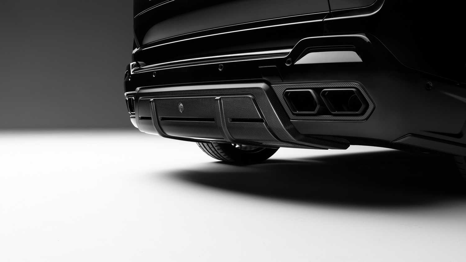 Very deep black paint makes it tougher to see exactly what Urban has done to this Cullinan, but also to some extent, that's the point. It has a wide range of new parts, including a new carbon fiber hood with exposed details, a new front bumper with extended blades and new LED running lights, a two-piece front splitter, and front upper vent overlays. Urban has also added wider sills, a new rear bumper, an anodized aluminum tailpipe, and a pair of rear spoilers. Everything, except for those pipes, is made from carbon. Much of it is painted, but some of it has exposed pieces or details to help show off.