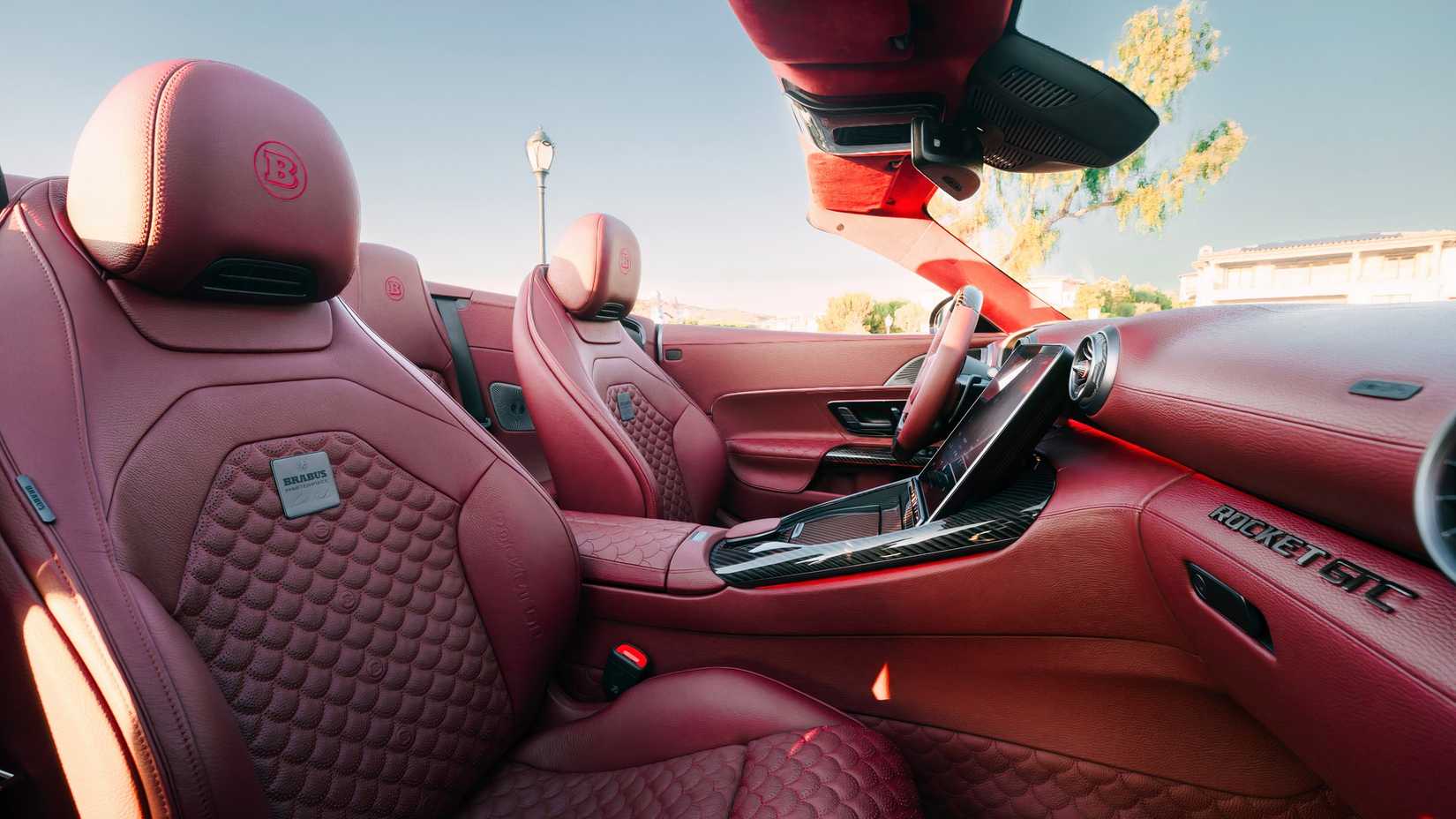 Inside, Brabus upholsters this Rocket GTC in a manner you'd expect from Brabus. Swaths of red leather matching the exterior are everywhere. The seating surfaces, door panels, and footwell trim have a quilted pattern. Meanwhile, the pedal pads, steering wheel trim, and entry panels have an illuminated Brabus logo.