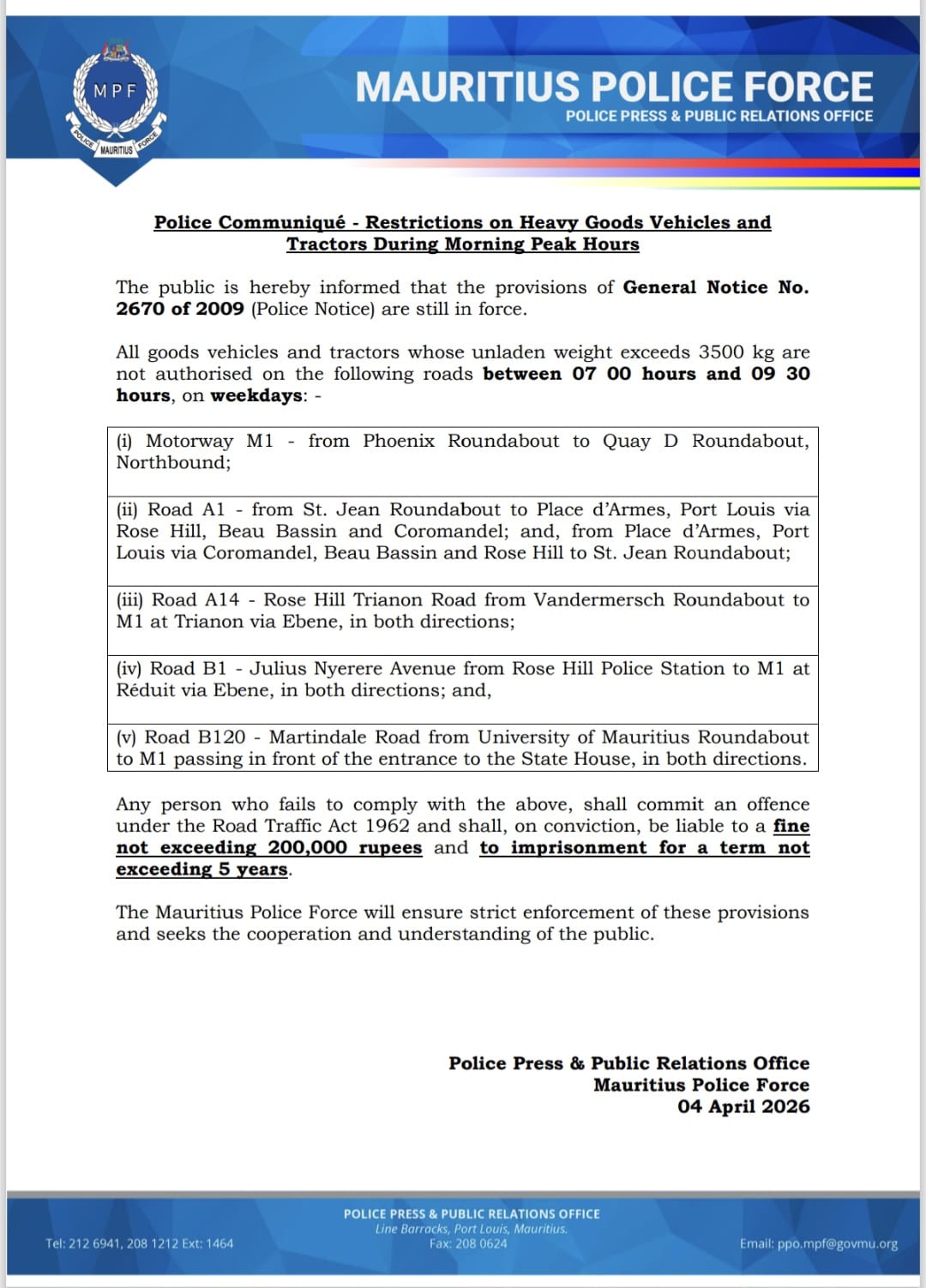 En vigueur depuis 2009 après un accident tragique à Montebello, cette réglementation sera strictement appliquée. Les contrevenants sont passibles de Rs 200 000 d’amende et de cinq ans de prison. Osman Mahomed souligne que la mesure s’inscrit dans un contexte de crise énergétique, visant à réduire les embouteillages, limiter le gaspillage de carburant et prévenir les accidents.