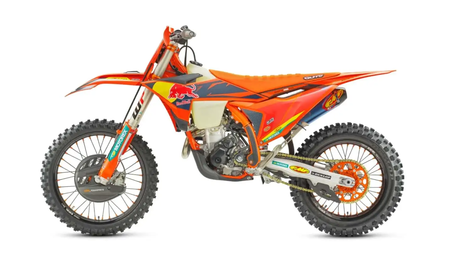 And it comes with a few more goodies, including: Red Bull FMF KTM Factory Racing Graphics, Factory Racing Seat, Factory Racing Triple Clamps, Factory Wheel Set, Factory Start Device, Factory Skid Plate, Factory Racing Front Brake Disc Cover, Semi-Floating Front Brake Disc, Solid Rear Brake Disc, Orange Anodized Rear Sprocket, and Hinson Outer Clutch Cover.