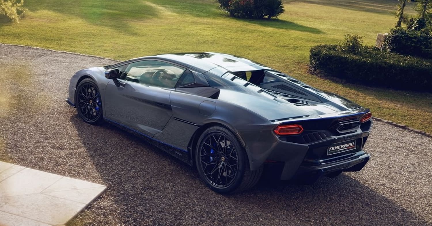 Dubbed the Temerario Porto Cervo, this one-off example is defined by a finish called Grigio Serget – a grey base that reveals embedded blue flakes under direct light. Gloss black elements in Nero Noctis outline the lower body, front splitter, rear diffuser, and side scoops. A slim pinstripe in Blu Royal provides a color break across the body, also found on the rear wing. Blue brake calipers hide behind Velador gloss black wheels, and matte black quad tailpipes add contrast at the rear.