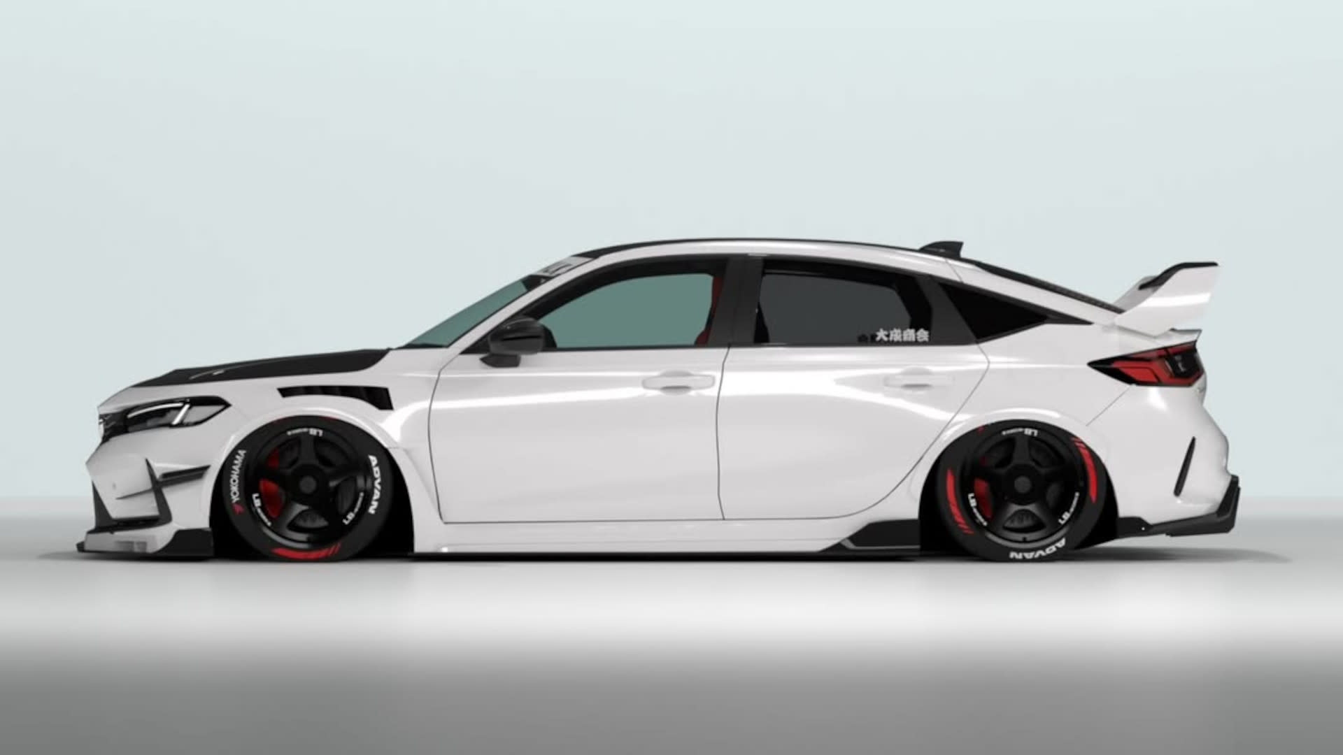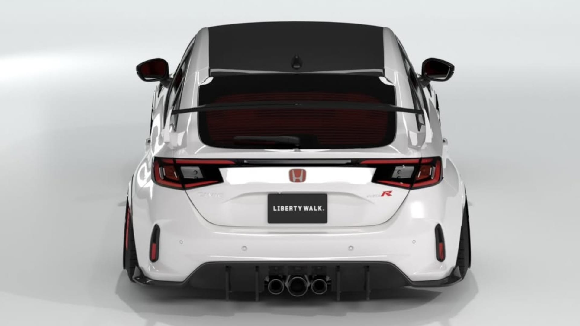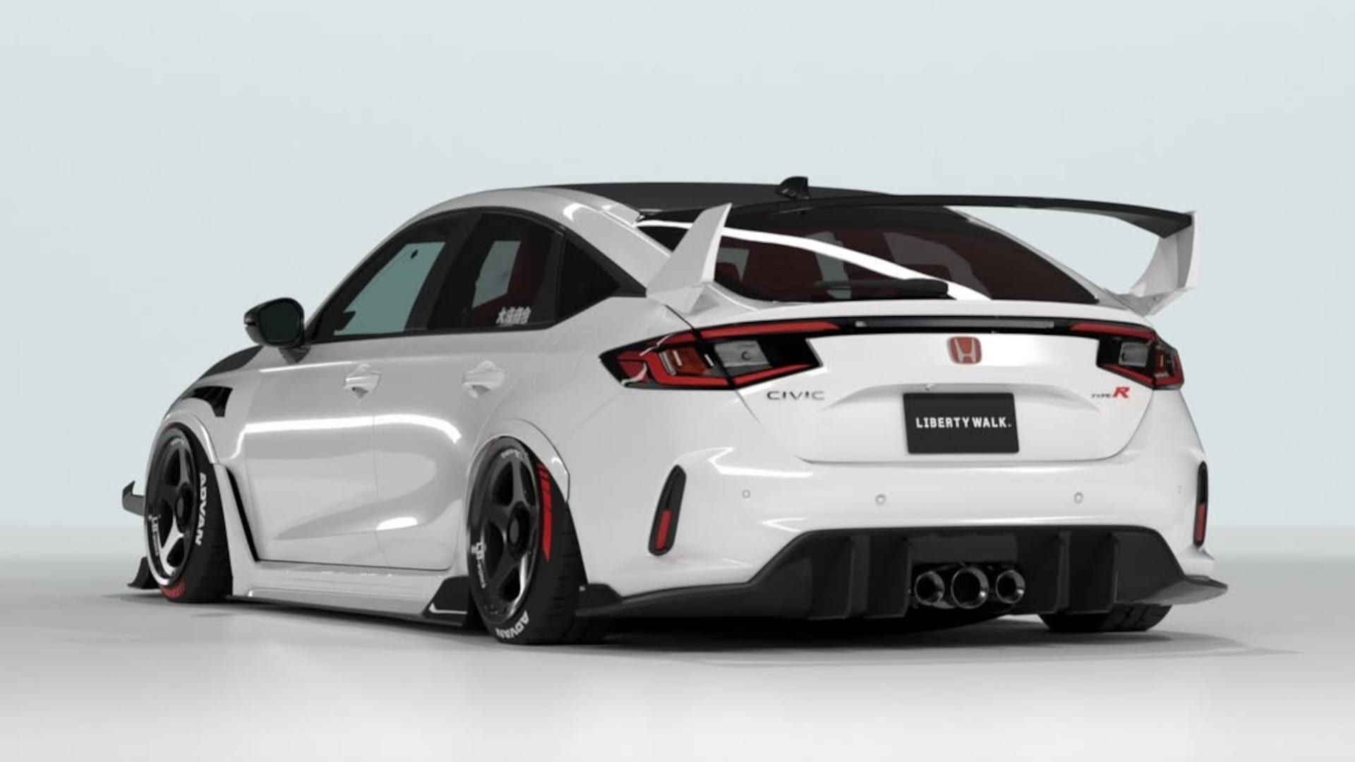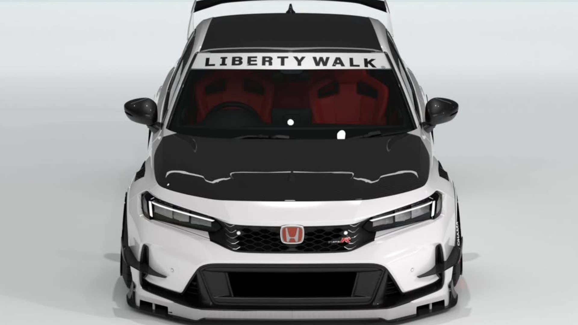 While most Liberty Walk creations feature bolt-on fender flares with exposed rivets, the tuner’s kit for the Civic Type R widens its track front and rear with subtle bodywork add-ons. The front fenders are replaced with vented items, and both front and rear arches get small extensions that flow with the bodywork—no obtuse caricature of the Civic’s form here. To make it all look cohesive, new side skirts have been fitted, with these adding a vent behind each front wheel and a small winglet ahead of each rear wheel. Speaking of the wheels, the Liberty Walk site lists these as cast SS-5 wheels wrapped in Yokohama rubber, though they look more like forged Desmond Regamaster EVO wheels. Elsewhere, the front bumper has been extended and fitted with a splitter and a pair of canards on each end, with a carbon fiber hood and a black roof adding contrast. Continuing the theme are some carbon fiber mirror caps and, at the rear, a large wing whose design appears to be inspired by that of the outrageously styled FK8-generation Civic Type R. Finally, a new diffuser that retains the CTR’s triple-exit exhaust in the center completes the look.