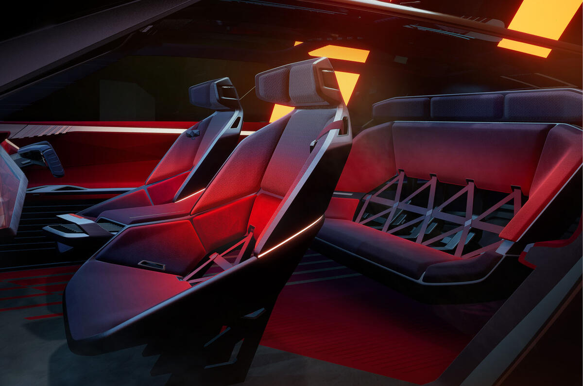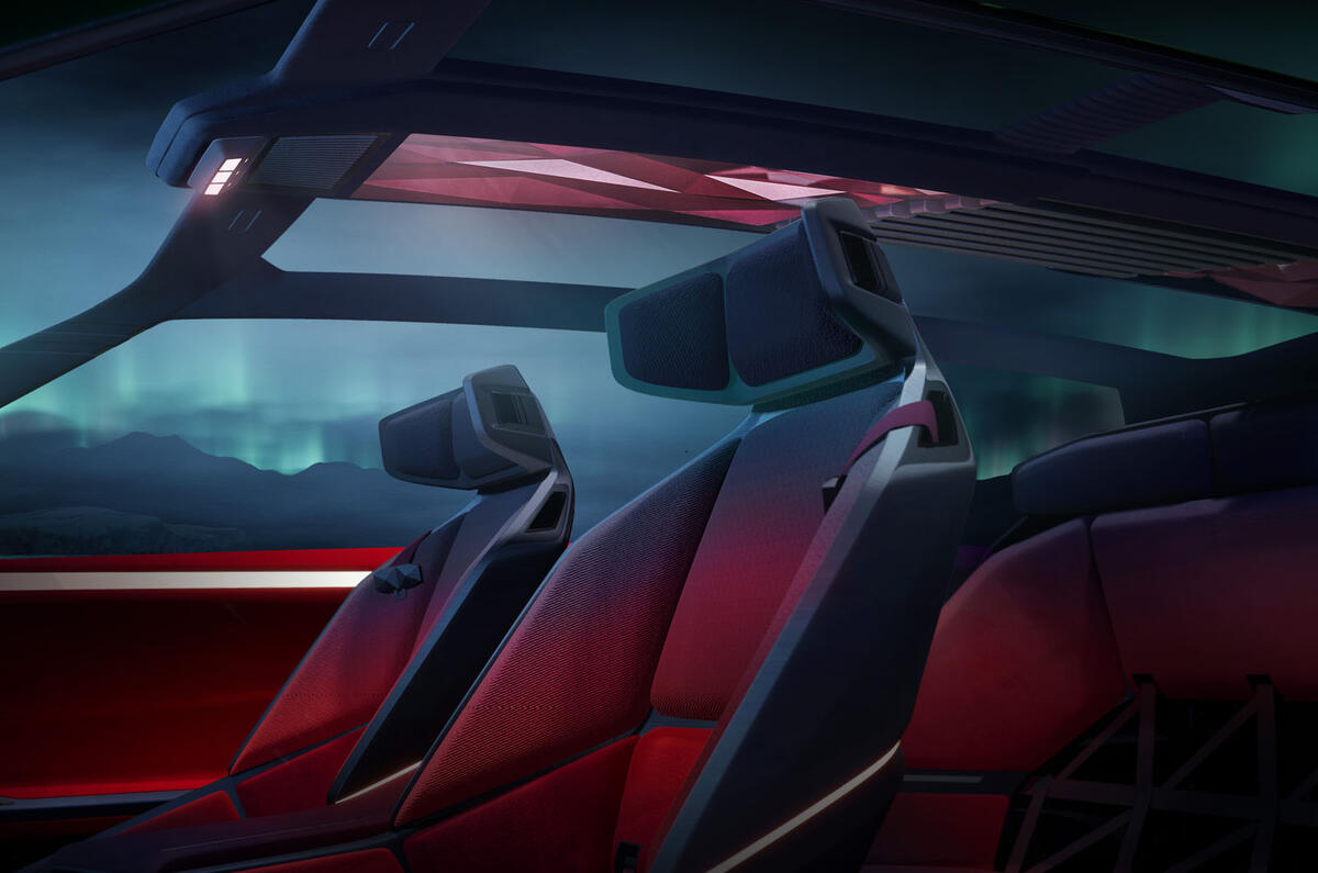 The interior, said to be inspired by kaleidoscopic triangles, features a customisable instrument panel and infotainment display - plus front seats that fold into the rear to create a lounge-style sofa arrangement.