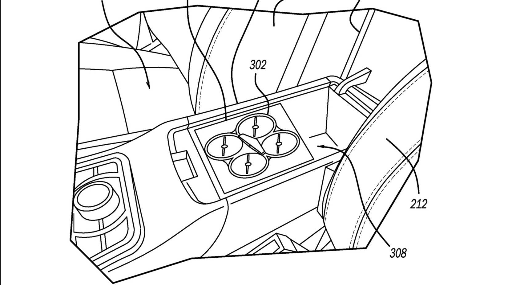 Essentially, the drone would dock in a storage compartment. The patent drawing shows the bin between the seats. It would then launch out of a hole in the roof, potentially a moonroof. The vehicle would monitor weather conditions with sensors and local weather data to ensure safe launch conditions or to recall the drone as needed.