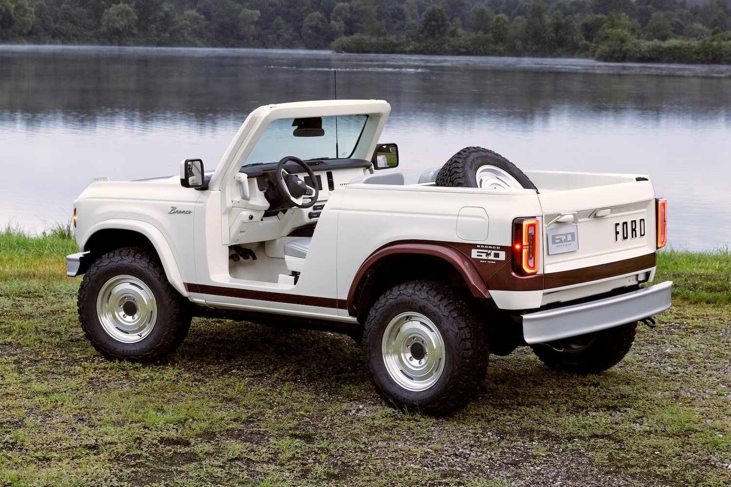 Ford stripped out the carpeting, leaving exposed steel floors and Wimbledon White-painted dash panels for a spartan, purposeful finish. The result blurs the line between interior and exterior – way beyond what you can do with a regular Bronco – a theme that matches the open-air philosophy behind the project.