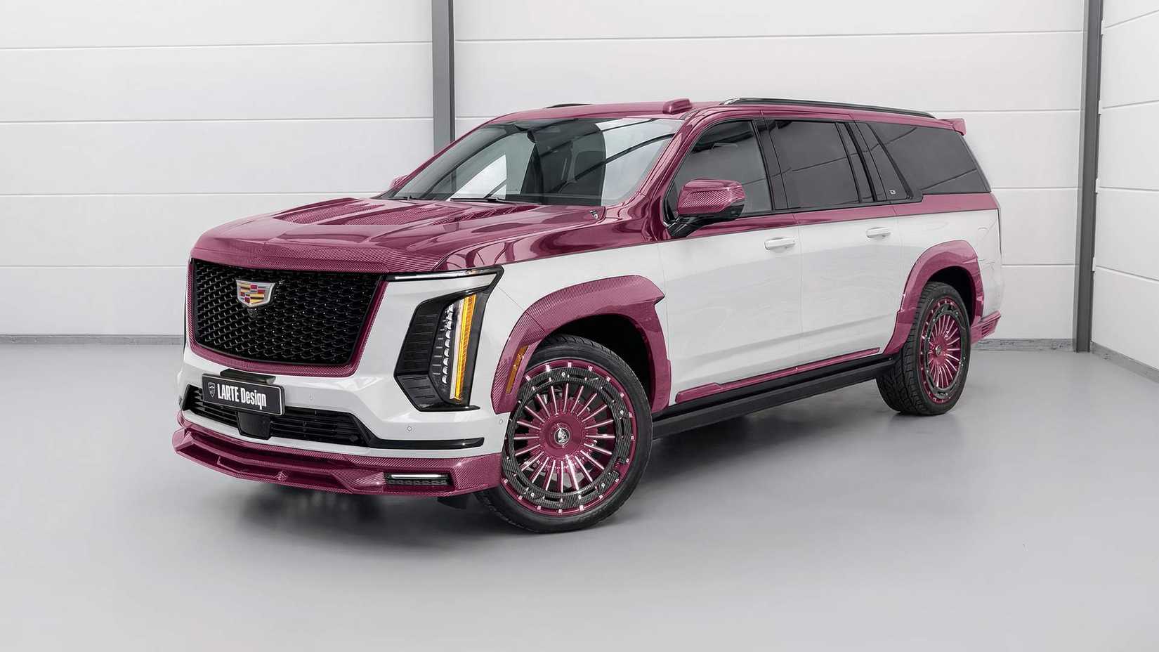 And then we have the wheels. Larte designs its own. They're forged, and they're finished in pink to match the body. The carbon trim disc on the top is just the cherry on this bright Escalade.