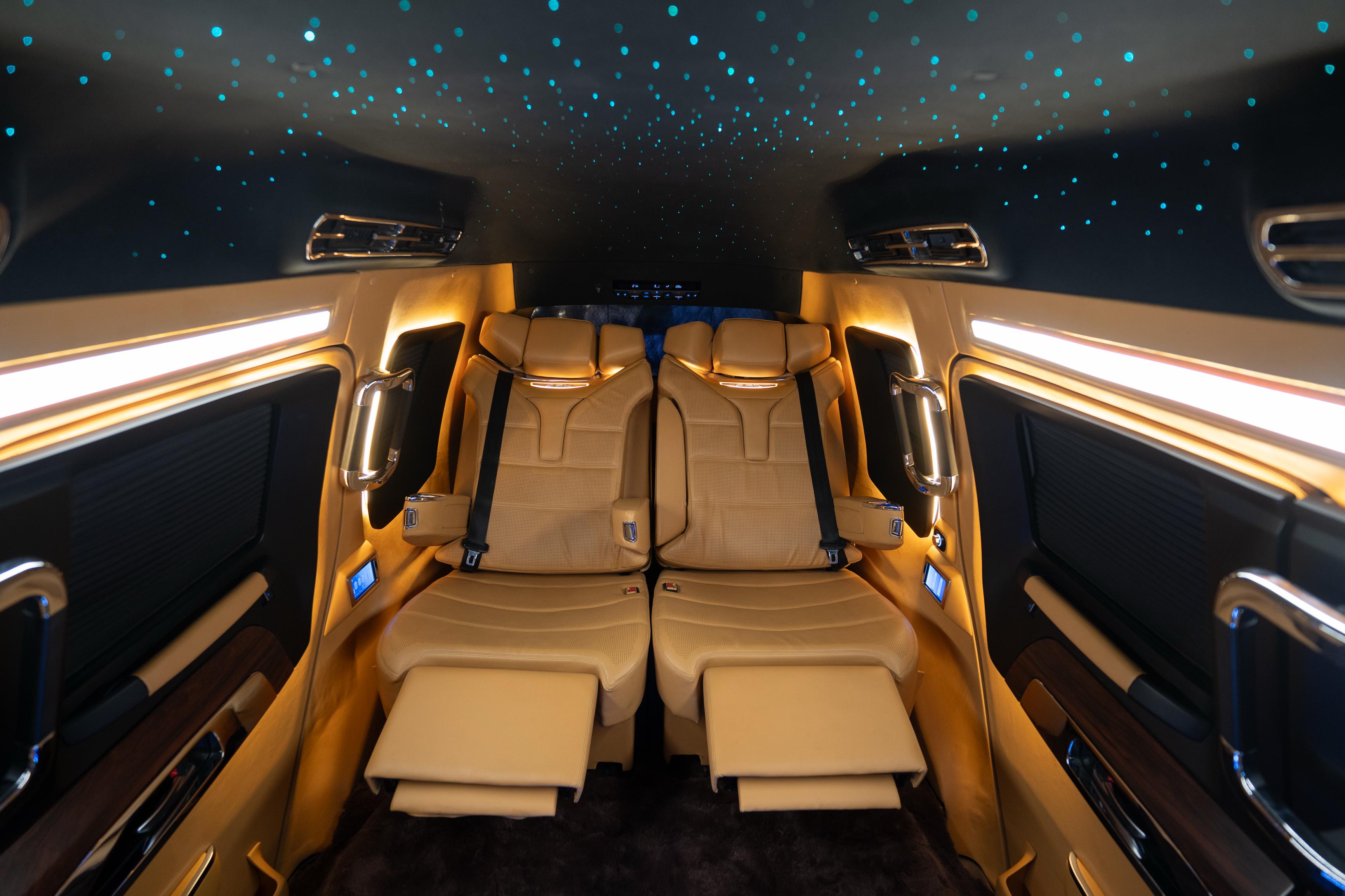 While this may have started life as a five-seater SUV the interior now resembles a comfortable lounge or private movie theatre. The cabin is finished in tan leather, with a pair of comfortable recliners with extendable leg rests, thick cushioning, and integrated armrests. These seats are positioned to the rear, facing the cavernous interior and a broad sofa. The side panels feature wood trim, black accents, and chrome grab handles, while privacy is ensured with powered blinds on all the windows. Thick carpeting on the floor, a starlight headliner up top, and warm ambient lighting give the space a cocooned, ultra-premium ambience, and a wall-to-wall television on the partition between driver and passengers completes the cinema effect.